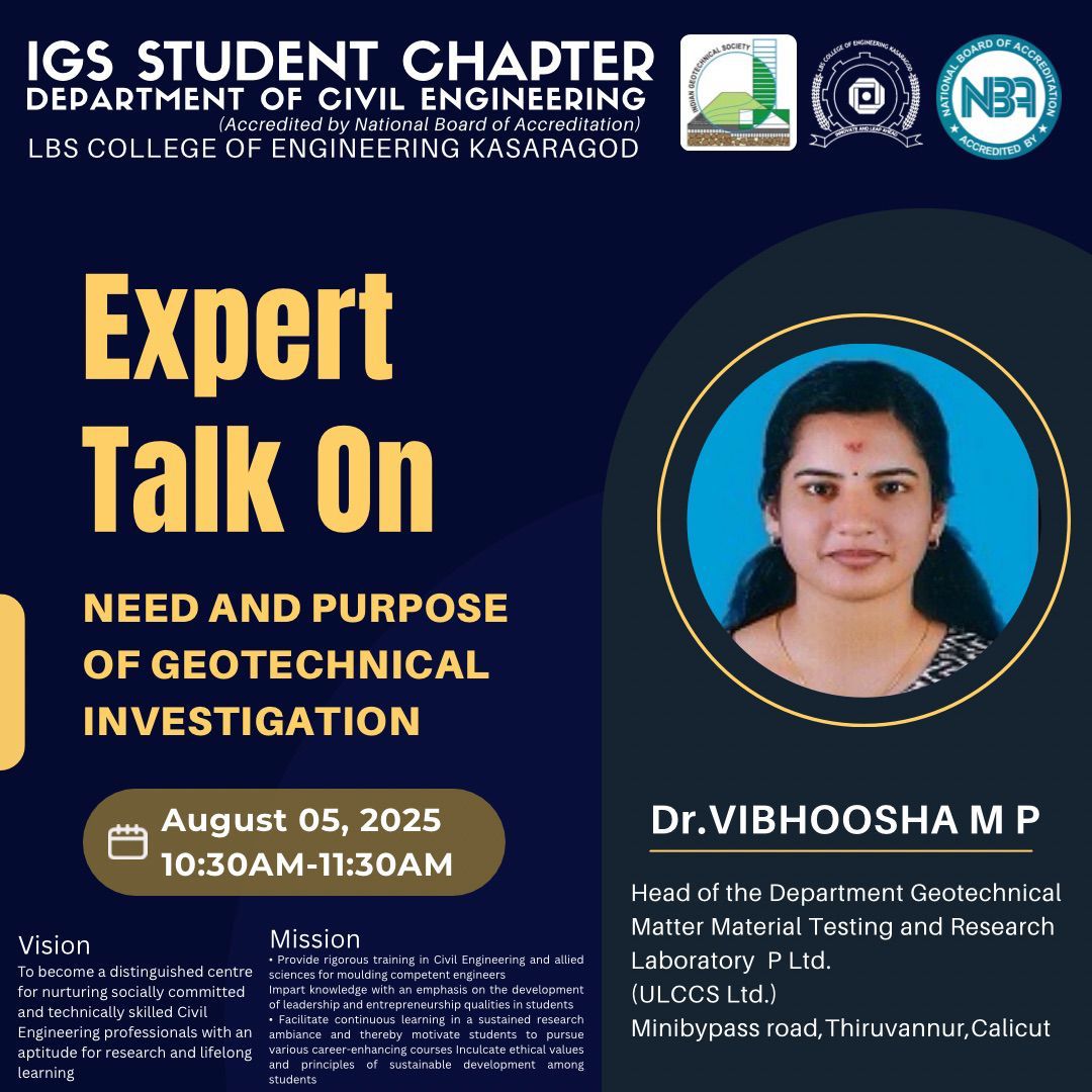 IGS student chapter of the department of civil engineering, coming under Indian Geotechnical Society – Kozhikode chapter, was inaugurated on 8th September, 2023. The Chief Guest of the inauguration was Dr. S. Chandrakaran, Professor, NIT, Calicut and Chairman, IGS Kozhikode Chapter. Dr. Jayamohan J., Principal, LBS Institute of Technology for Women, Trivandrum and Hon. Secretary, IGS Thiruvananthapuram Chapter was also there to honour the event.