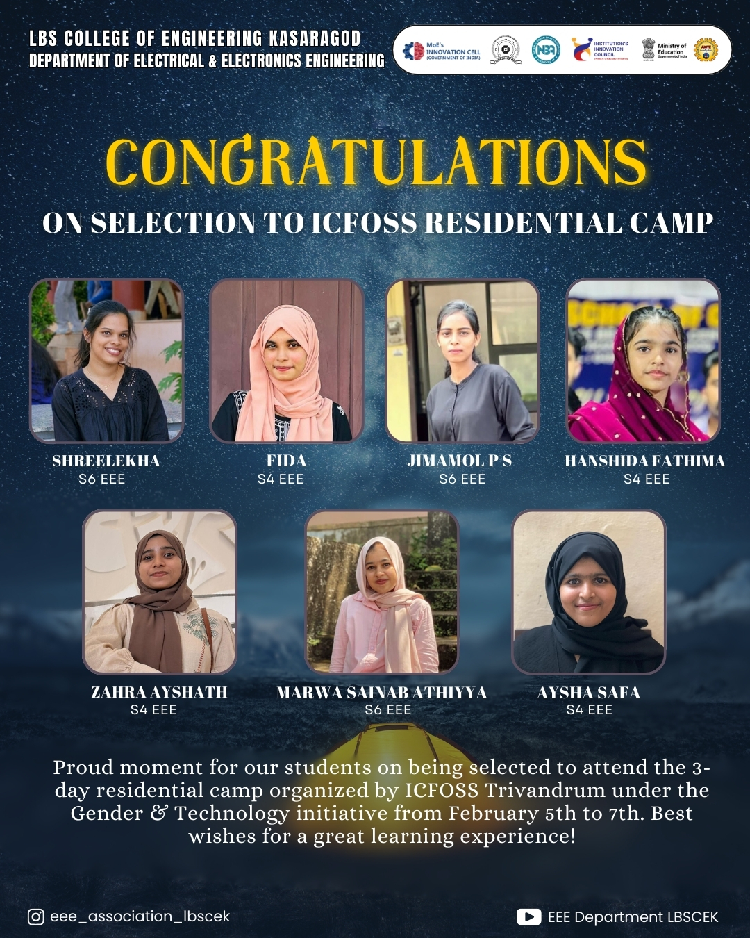 The department takes pride in its numerous distinguished alumni who have bagged university ranks and hold prominent positions in esteemed organizations such as NTPC, KSEB, HAL, DRDO, ISRO, Electrical Inspectorate, Railways, Civil Services, and various reputed organizations both in India and abroad. These alumni maintain continuous interactions with the department, offering invaluable guidance and support for the benefit and advancement of current students.